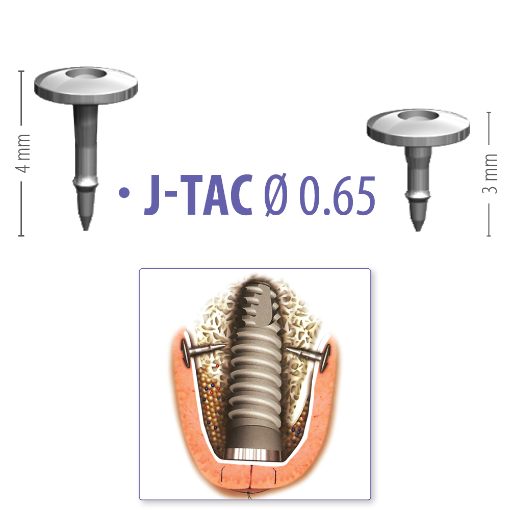 The tacks allow the stabilization of a membrane on a maxilla or mandible. The J-TAC system will ensure excellent stabilization of the membrane on the bone after insertion. Made of grade 5 titanium alloy (ASTM F 136) with a unique circular tack-driver interface and one barb on each tack. This J-TAC design, along with the offset driver design, allows for a clear visualization during tack placement.